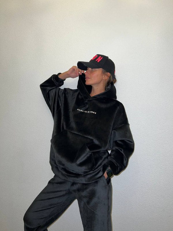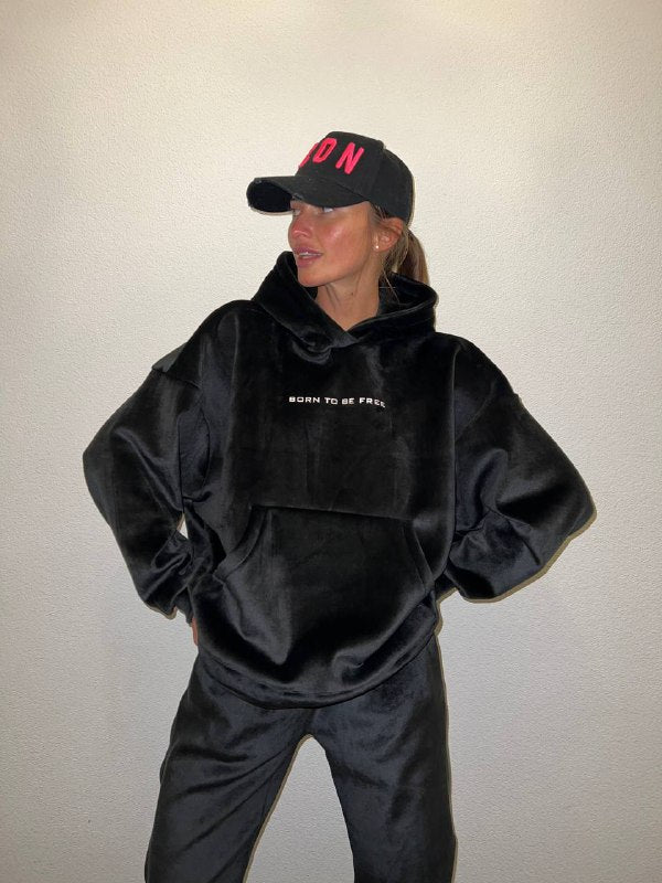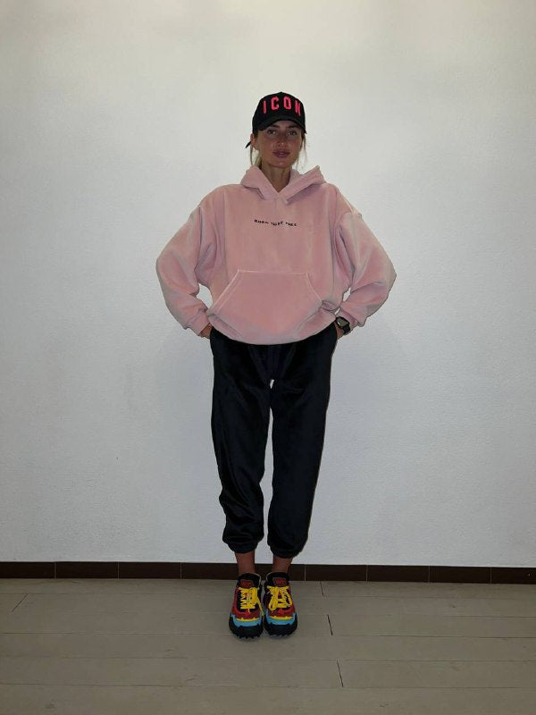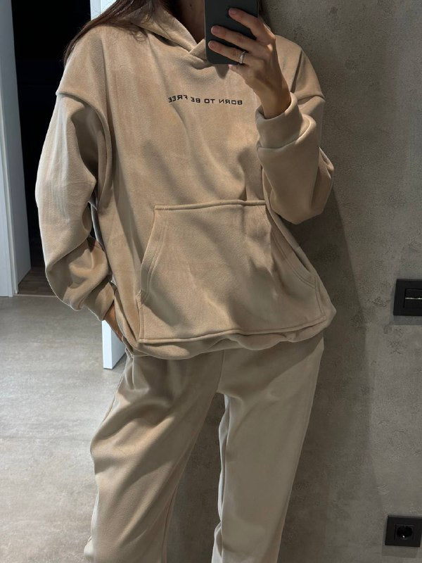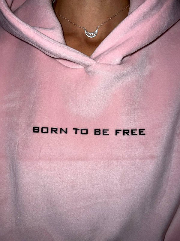 - Mikina s hlubokou kapucí, praktická přední kapsa a nápisem "Born to be free"