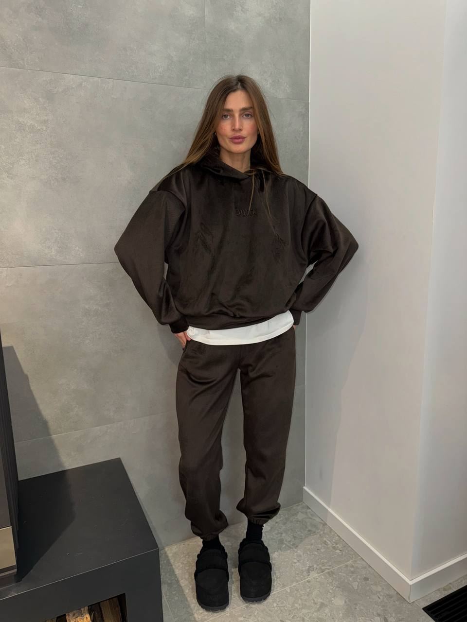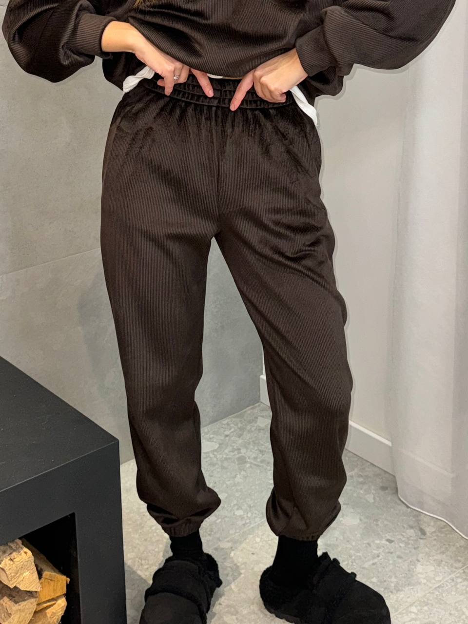 Trendy oversized dámská souprava. Pletený materiál s hřejivým vnitřkem a manšestrovým efektem zvenčí. Mimořádně měkká a pohodlná.