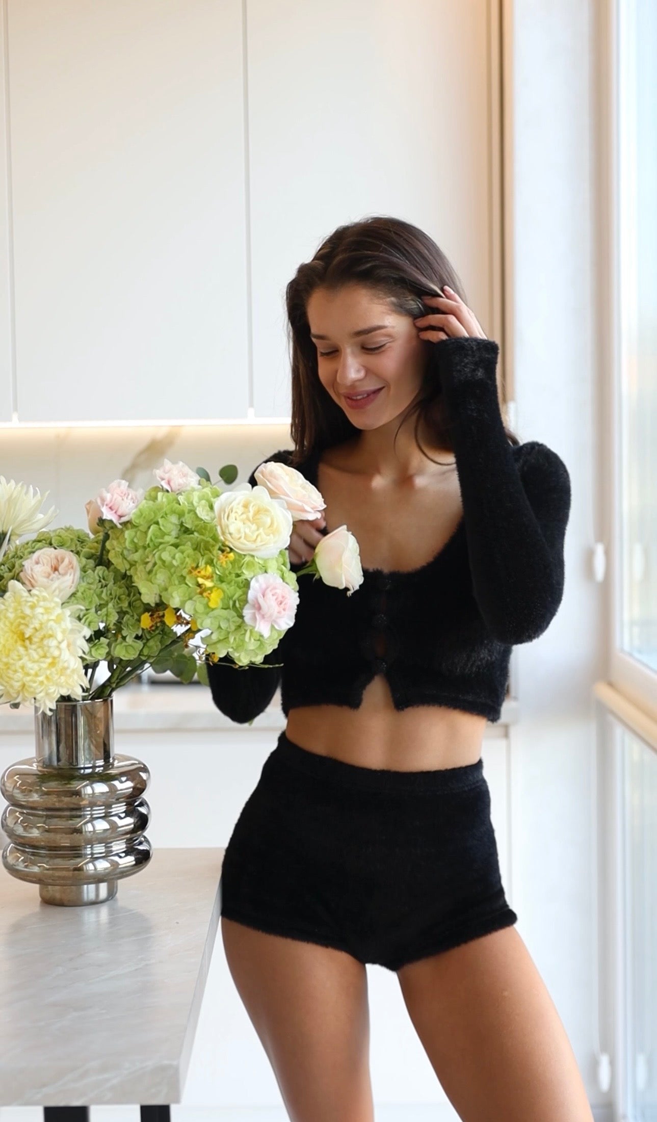 Ultra měkký, heboučký materiál jemně obepne postavu a dodá pocit tepla i během chladnějších dnů. Krátké šortky a crop svetřík se zapínáním na knoflíky tvoří dokonalou kombinaci pohodlí a ženské smyslnosti. Ideální na relax doma, víkendové lenošení i večery s oblíbeným filmem.