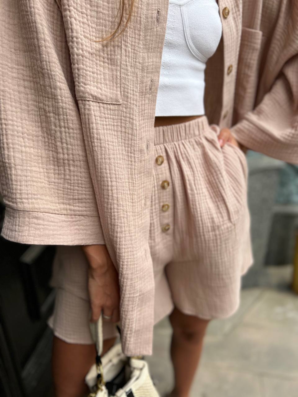 V pase mají šortky pružnou komfortní gumu, na přední straně ozdobné knoflíky.