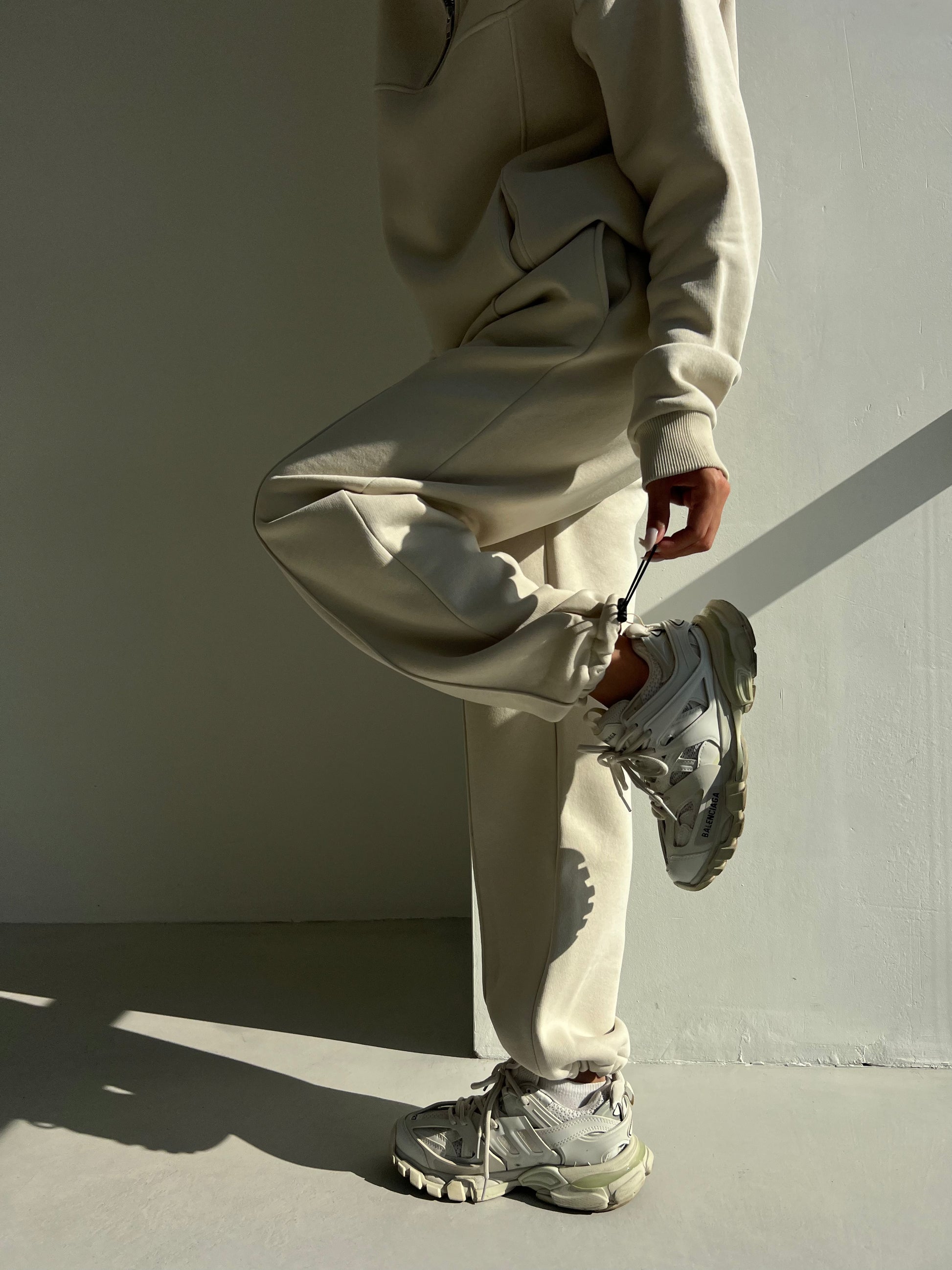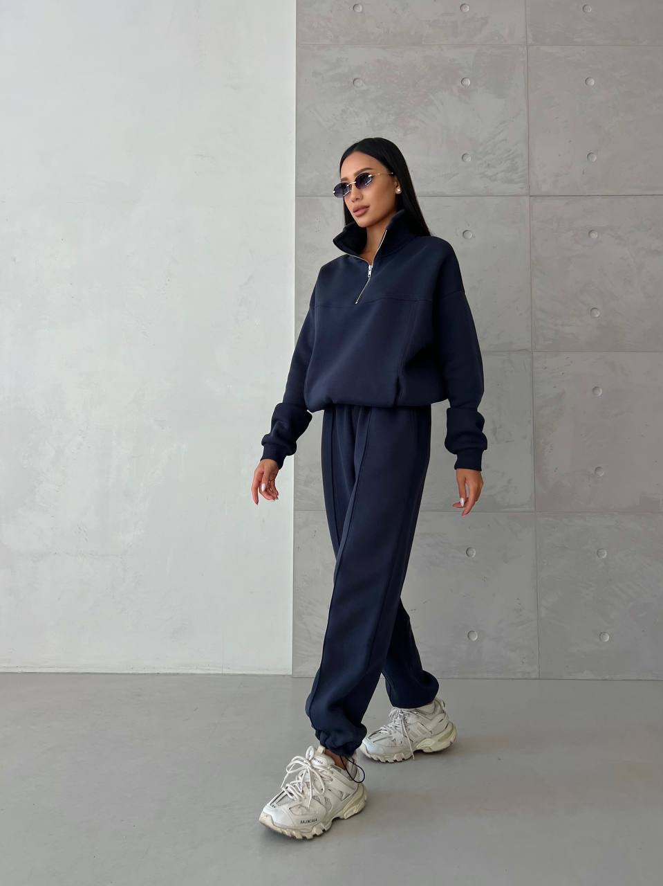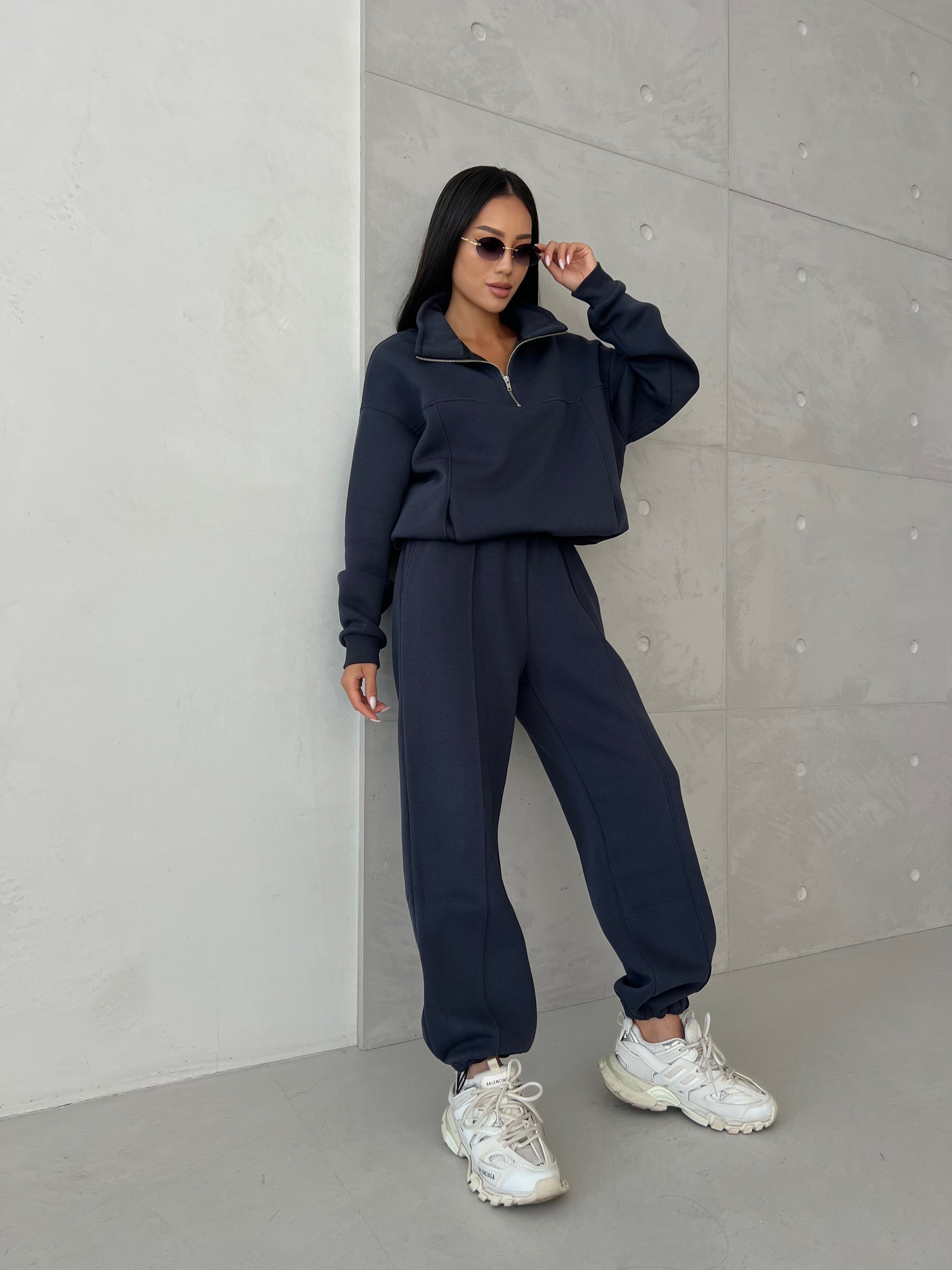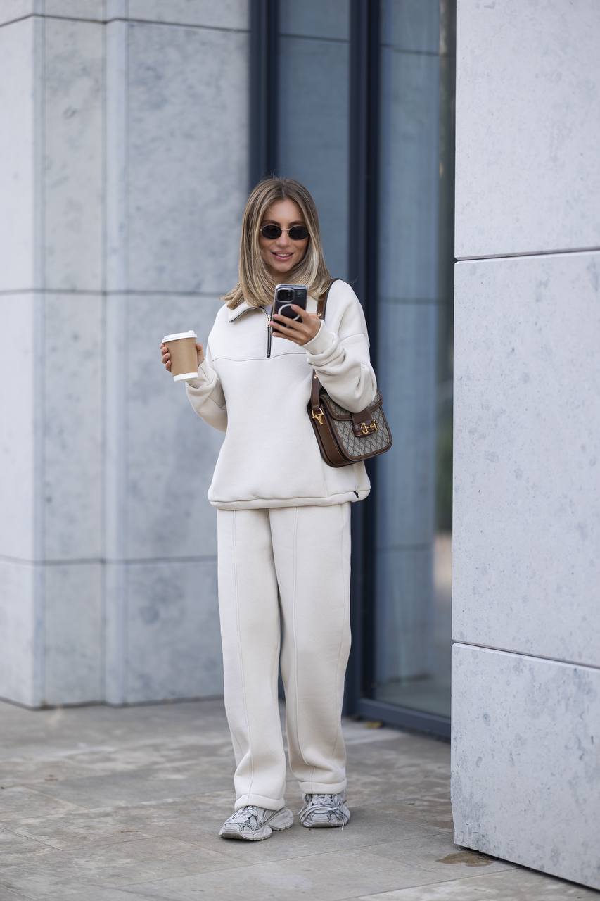 - Volný střih mikiny se zipem a jogger kalhoty s elastickými manžetami tvoří perfektní set.