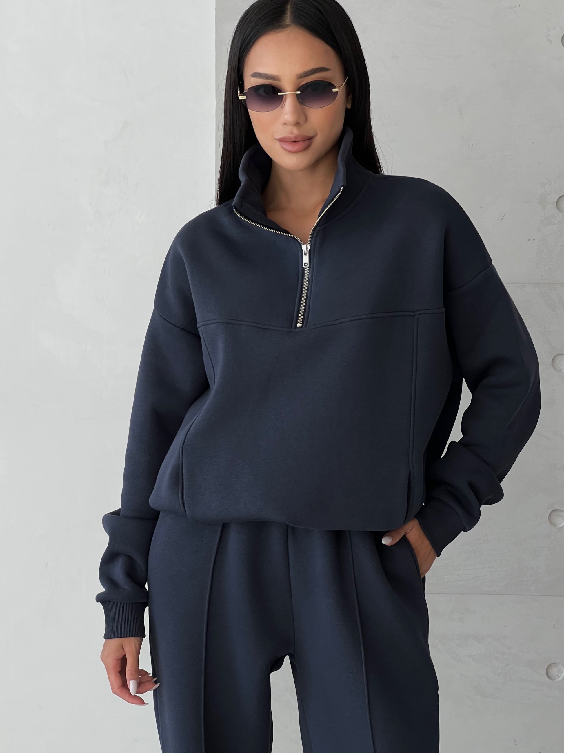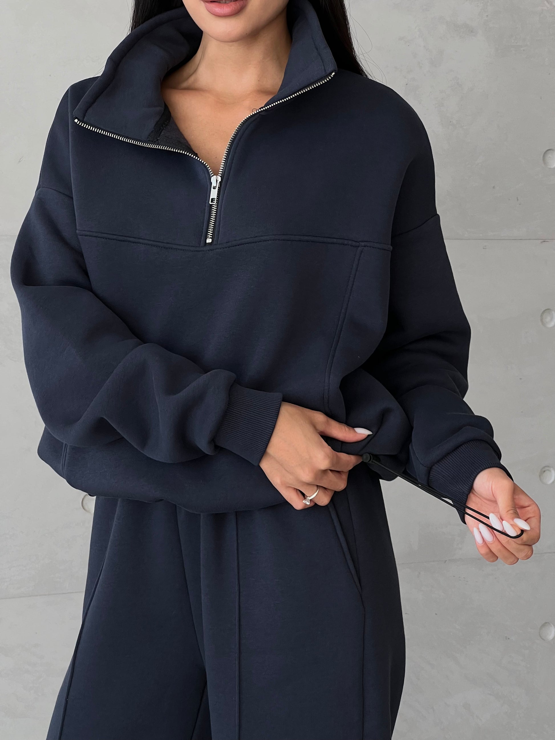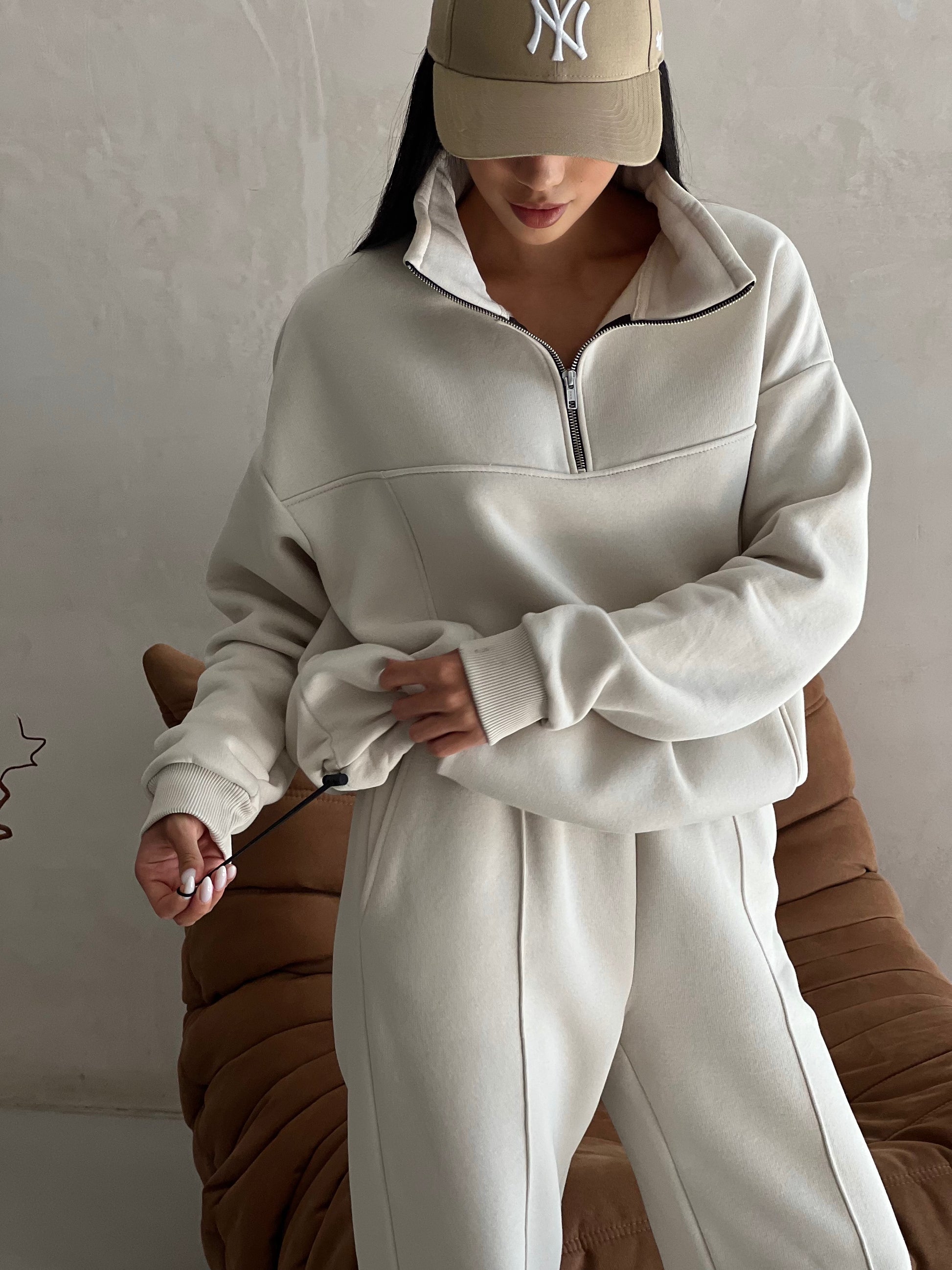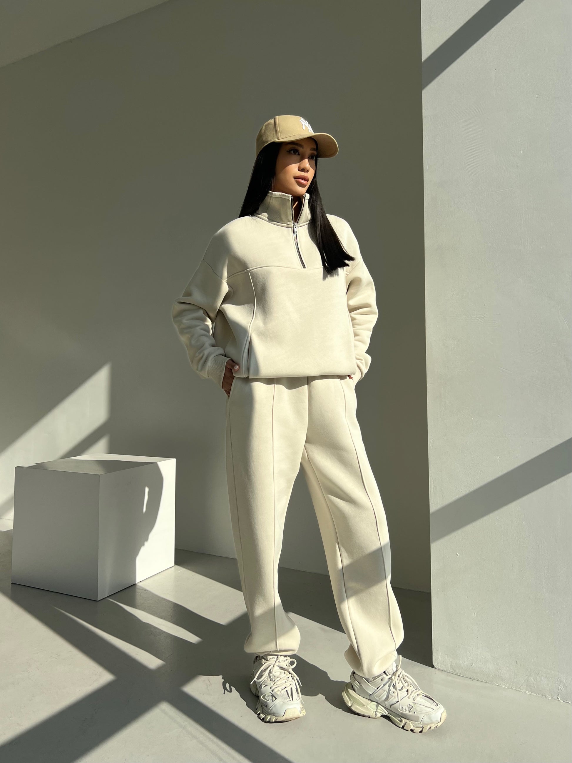 - Volný střih mikiny se zipem a jogger kalhoty s elastickými manžetami tvoří perfektní set.