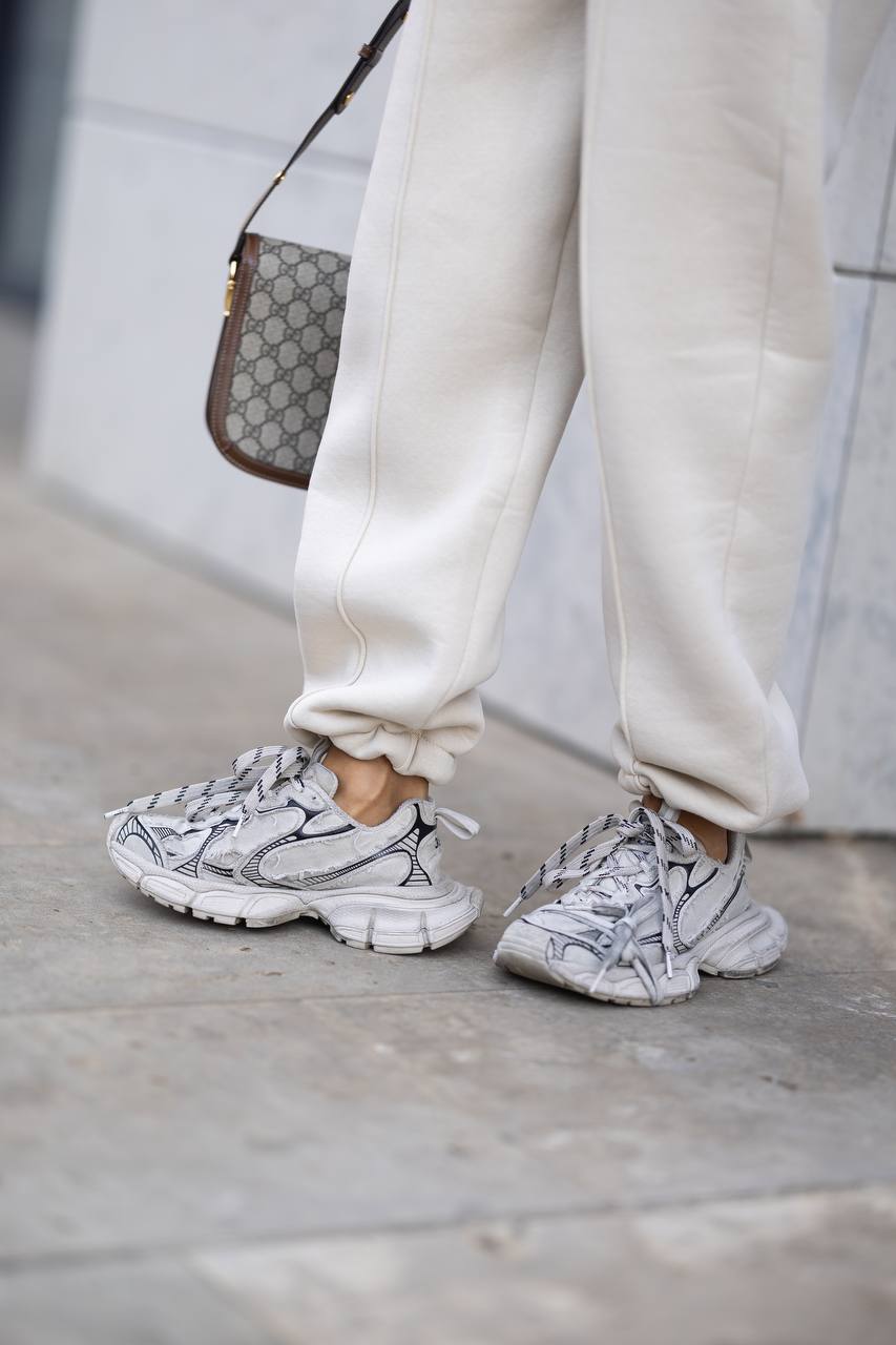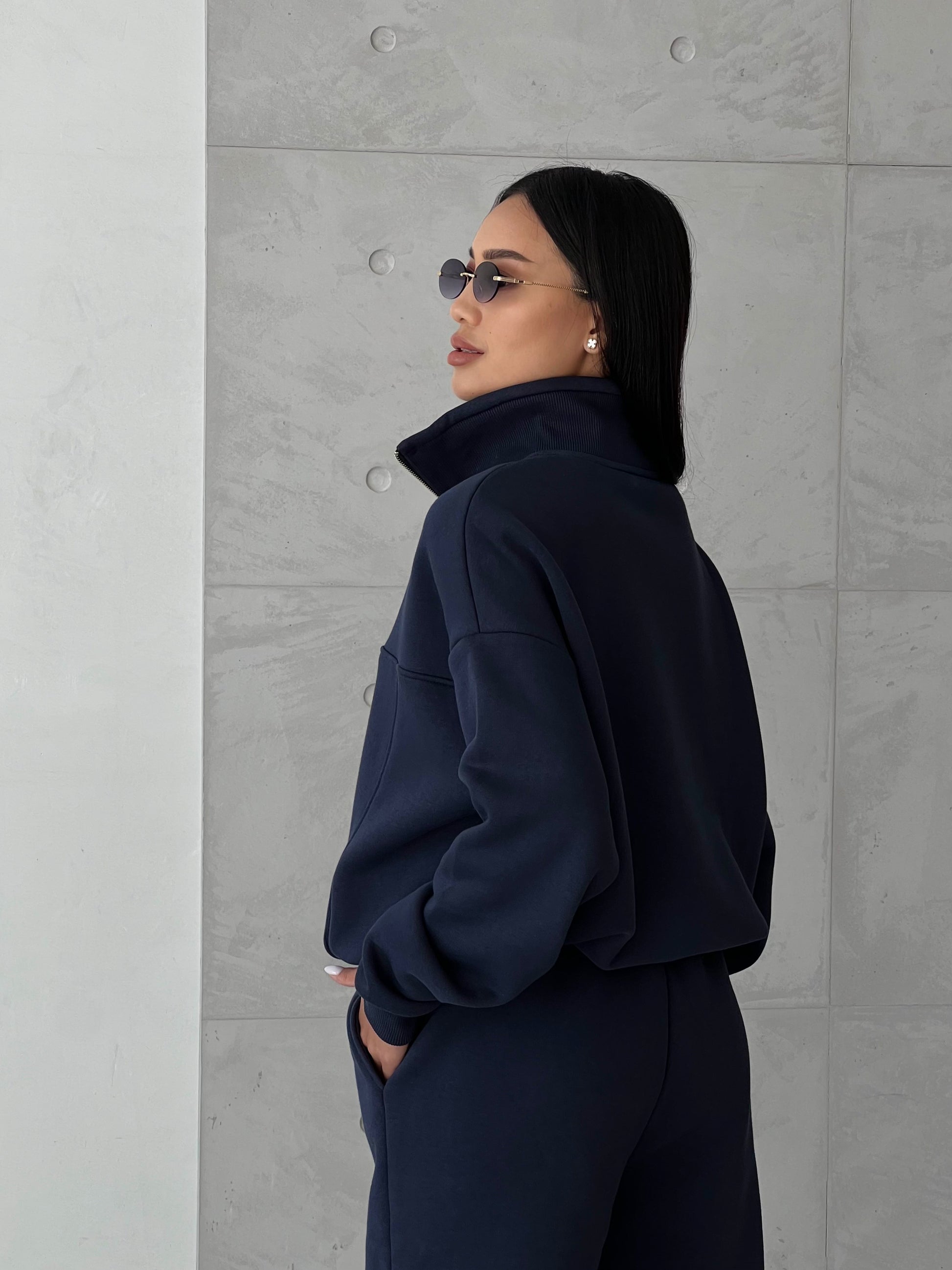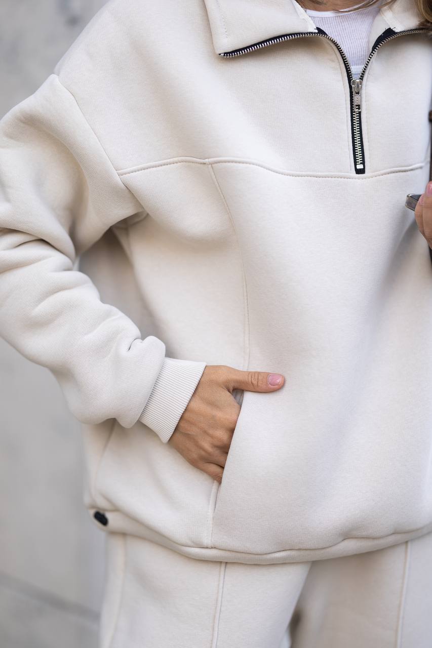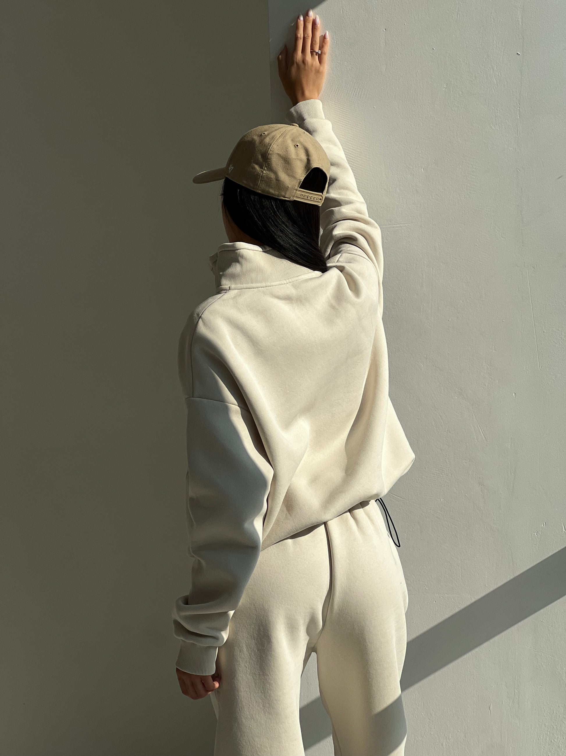 - Volný střih mikiny se zipem a jogger kalhoty s elastickými manžetami tvoří perfektní set.