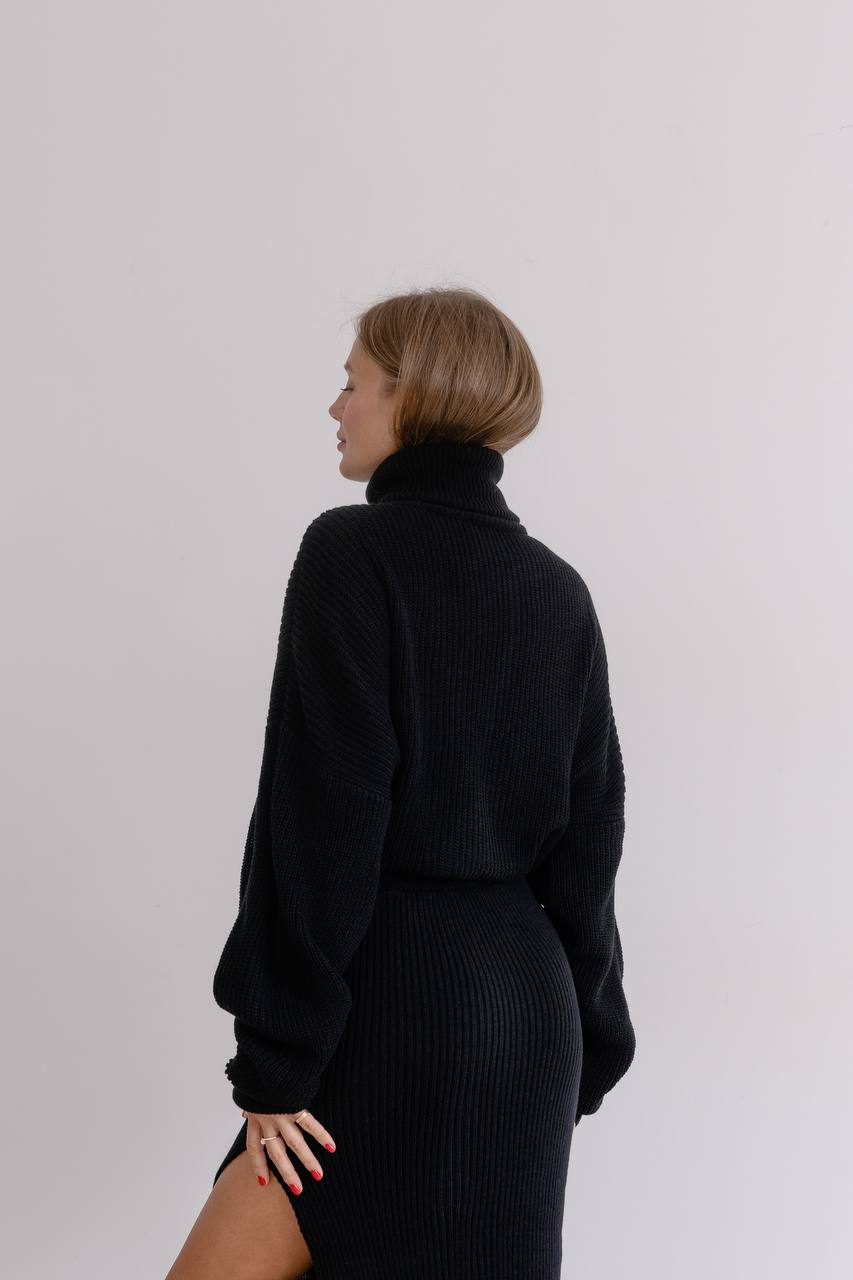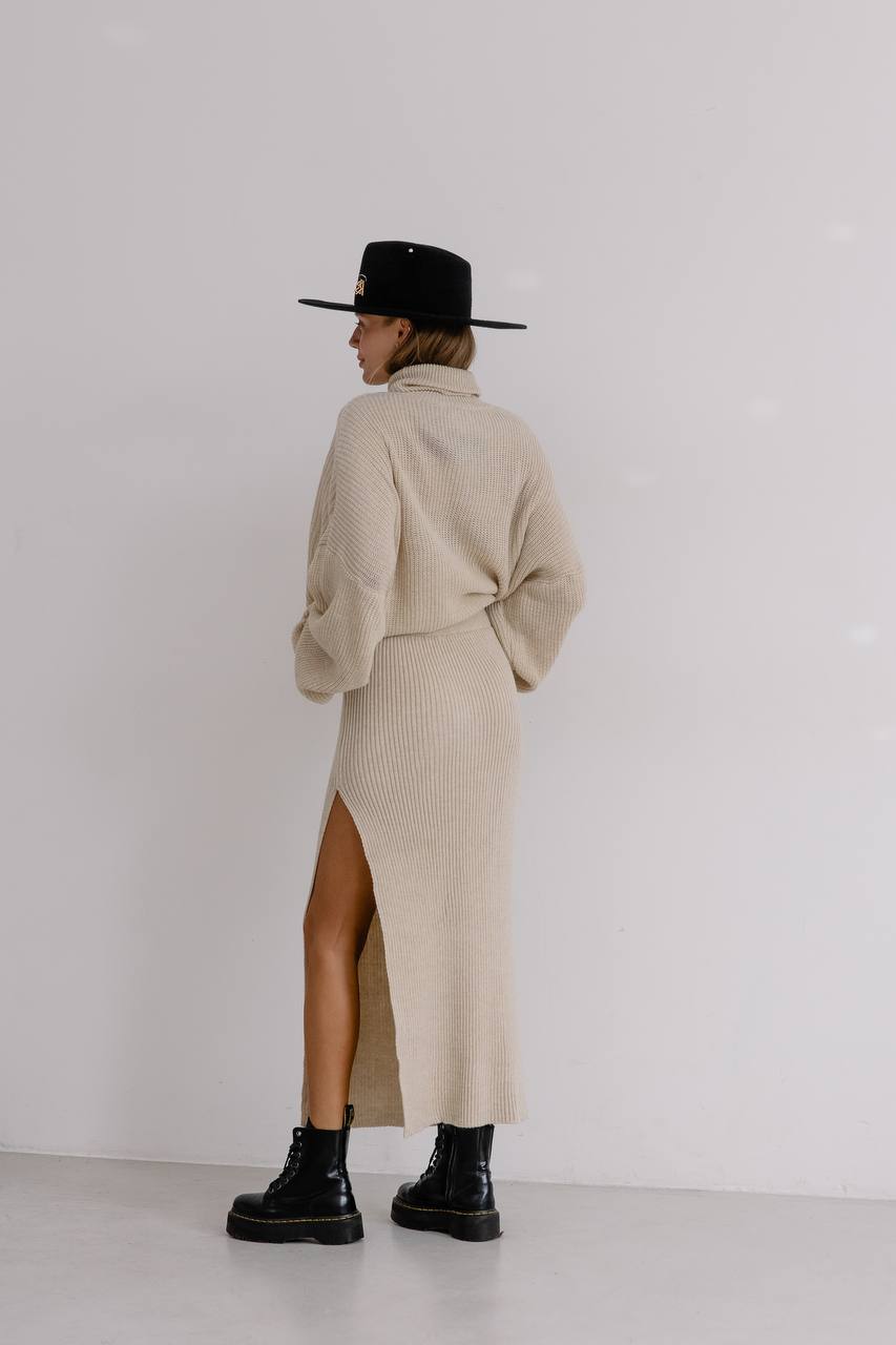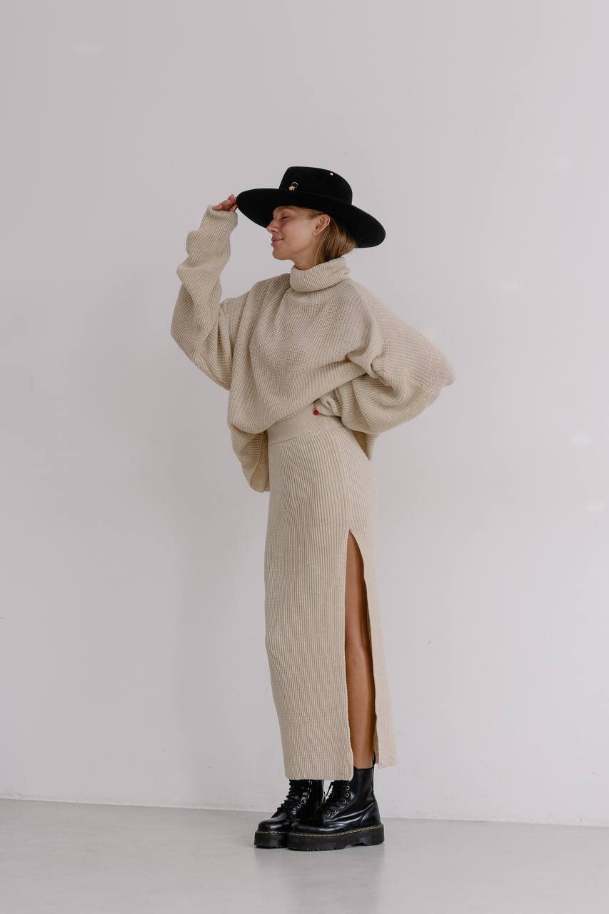 - Rafinovaná sukně s rozparkem podtrhuje ženskost, zatímco volný svetr vytváří příjemně ležérní dojem.